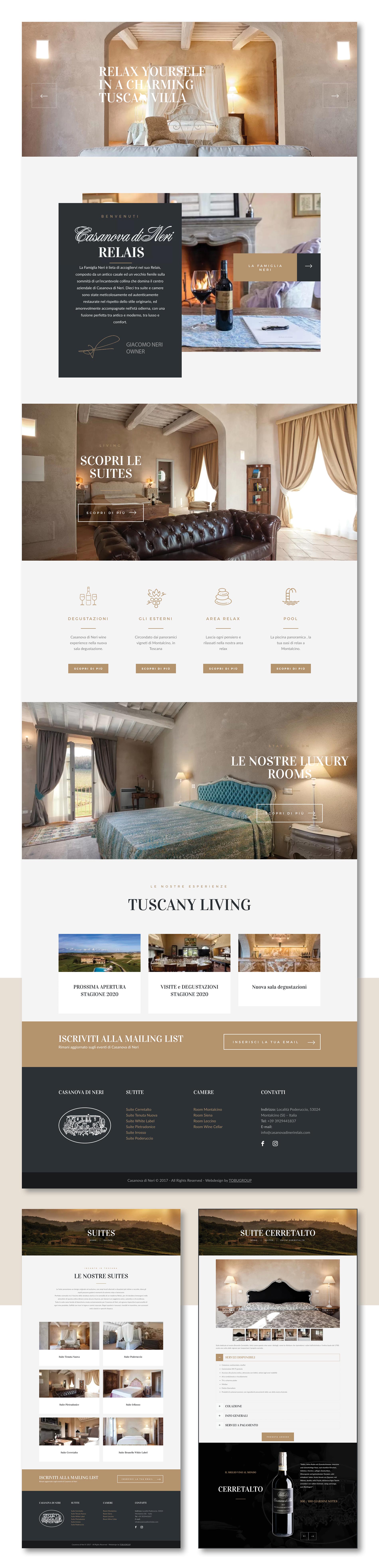 Il Wine Relais della Famiglia Neri è composto da un antico casale ed un vecchio fienile sulla sommità di un’incantevole collina che domina il centro aziendale di Casanova di Neri. 10 tra suite e camere formano un perfetto connubio tra il fascino della struttura storica, le comodità di un moderno Relais e i migliori vini del mondo. L’azienda si è rivolta alla Tobu Group per la consulenza turistica e la realizzazione del sito web della struttura, l’integrazione con il motore di prenotazione, la grafica e la stampa delle brochure e delle directories del relais. Il design del sito è stato pensato e progettato secondo le logiche ed i criteri dell’UX design turistico, ovvero favorendo un’esperienza utente semplice, informativa e improntata alla conversione. Nella realizzazione del progetto è stato riportato il carattere distintivo del relais, e della strategia di promozione della struttura, dove ogni suite rappresenta un vino di Casanova di Neri con un proprio tema cromatico e finiture personalizzate. Wine Relais a Montalcino